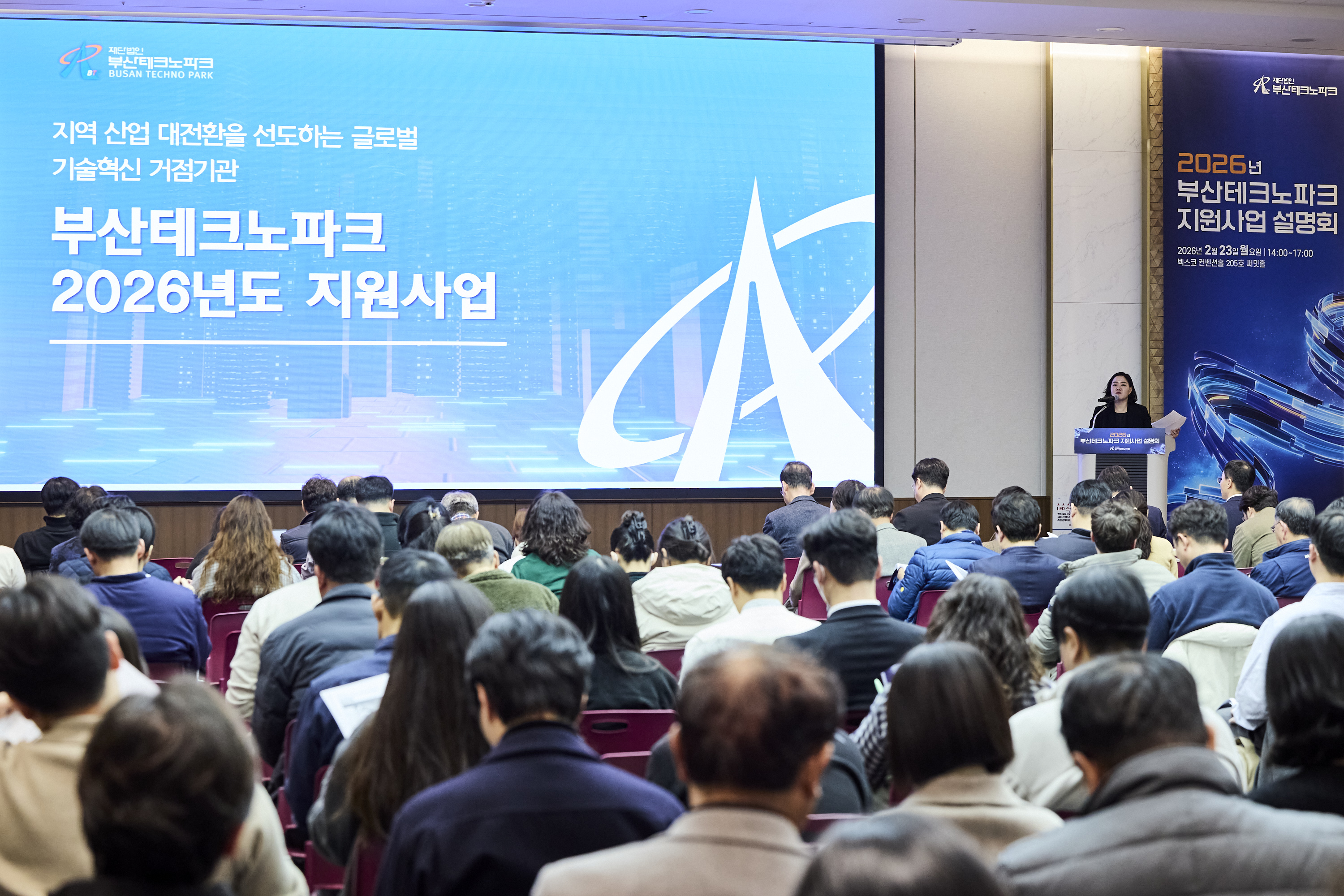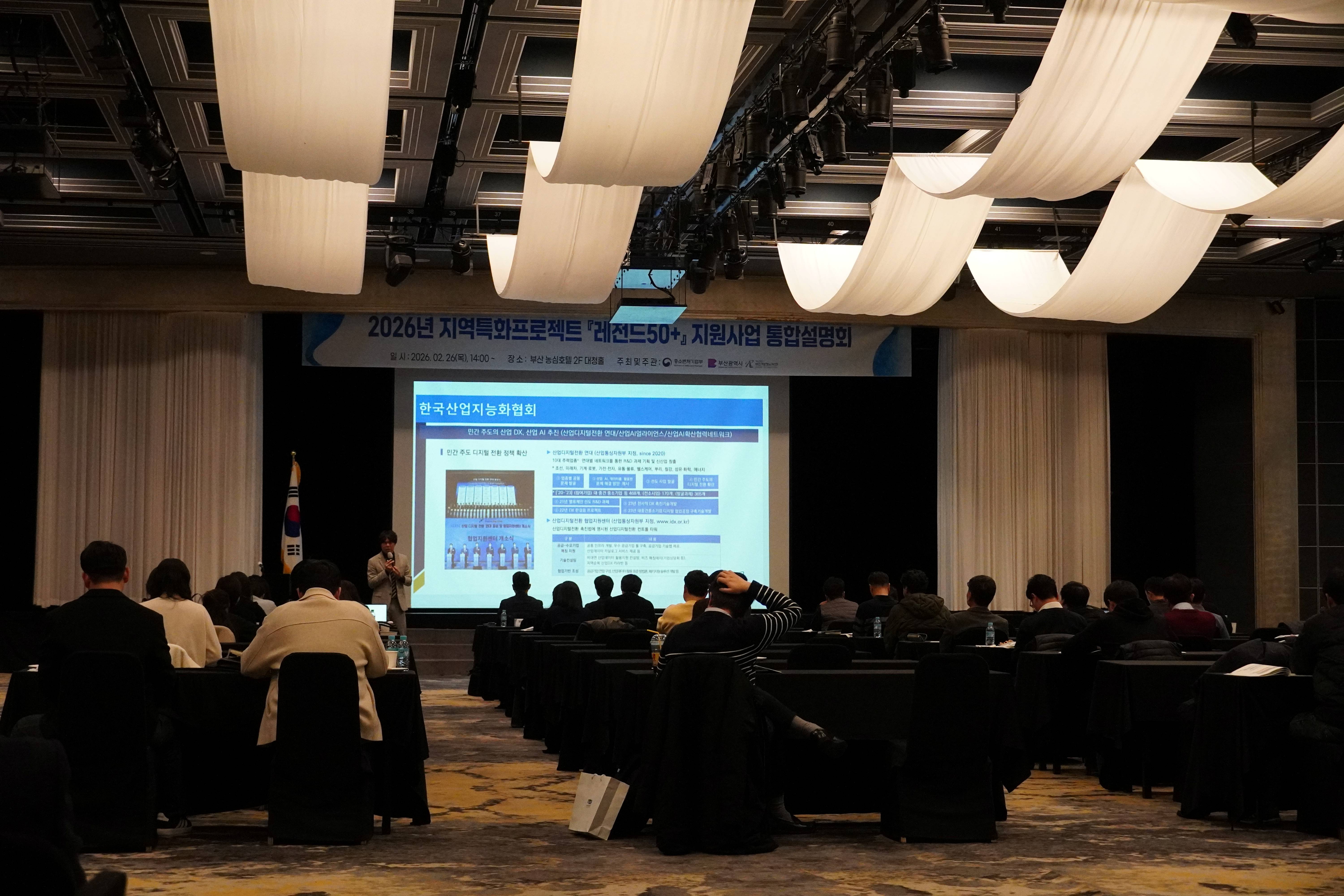부산테크노파크는 지난 2월 26일, 부산 농심호텔에서 ‘2026년 지역특화 프로젝트 『레전드50+』(이하 레전드50+)’ 통합 사업설명회를 성황리에 개최했다. ‘레전드50+’는 중소벤처기업부와 광역자치단체가 협업하여 지역의 주력산업을 육성하고, 해당 분야 중소기업을 집중 지원해 지역 경제에서 중소기업이 차지하는 매출 및 수출 비중을 50% 이상으로 높이겠다는 핵심 프로젝트다. 이번 설명회는 부산의 주력산업인 ▲친환경에너지 ▲초정밀소재부품 ▲실버케어테크 분야 기업들을 대상으로, 2026년 새롭게 개편된 지원내용과 참여 방법 등을 종합적으로 안내하기 위해 마련되었다. 특히 올해에는 기존 중기부의 6대 핵심 지원 수단(혁신바우처, 수출바우처, 정책자금, 스마트공장 구축, 부산 지역주력산업육성(비R&D), 기술보증기금) 외에도 부산시가 자체적으로 추가 발굴한 ▲고용유지 ▲청년 및 시니어 고용지원 ▲지식재산 긴급지원 등 다양한 지자체 지원사업을 연계하여 지원범위를 대폭 확장했다. 부산테크노파크는 지난해 레전드50+ 1.0 및 2.0 성과평가에서 모두 전국 최우수(S)등급을 획득하며 지역 맞춤형 산업 육성 역량을 인정받은 바 있다. 이를 바탕으로 2026년에는 약 130억 원 이상의 예산을 투입해 참여기업의 경쟁력 고도화와 글로벌기업 시장 진출을 본격 지원할 방침이다. 한편 이날 행사에서는 사단법인 한국산업지능화협회 추현호 센터장의‘디지털 전환을 위한 중소기업 제조AI 도입 사례와 혁신 전략’을 주제로 특별 강연을 진행했다. 강연에서는 제조 AI 도입 사례를 기반으로 AX(Artificial Intelligence Transx-x-x-x-x-x-x-formation) 시대에 요구되는 기업의 전환 전략과 실행 방향을 제시했다. 부산테크노파크 김형균 원장은 “오늘 설명회에 참석한 참여기업은 부산 경제의 미래를 이끌어갈 핵심 동력”이라며, “레전드 50+ 프로젝트가 단순한 지원을 넘어 기업의 실질적인 글로벌 경쟁력 강화로 이어질 수 있도록 밀착 지원 시스템을 가동하겠다”고 강조했다.